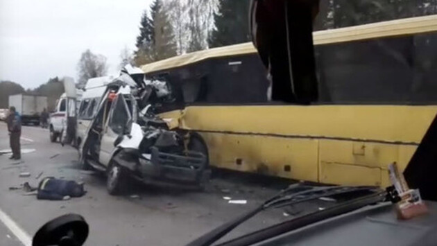 В сети было опубликовано видео с места столкновения двух автобусов в Тверской области, в которой, по последним данным, погибли 13 человек. На кадрах видно, что половина микроавтобуса в результате аварии оказалась смята, на месте ДТП работают сотрудники ГИБДД и МЧС. Утром 5 октября на трассе Тверь — Ржев неподалеку от села Некрасово произошло лобовое столкновение автобуса "ЛиАЗ" и микроавтобуса Ford Transit. По данным ГИБДД, причиной ДТП стал выезд микроавтобуса на встречную полосу. Ранее сообщалось, что по факту аварии в Тверской области возбуждено уголовное дело.