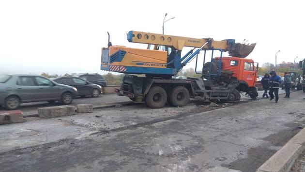 На Мызинском мосту экскаватор снес бетонное ограждение