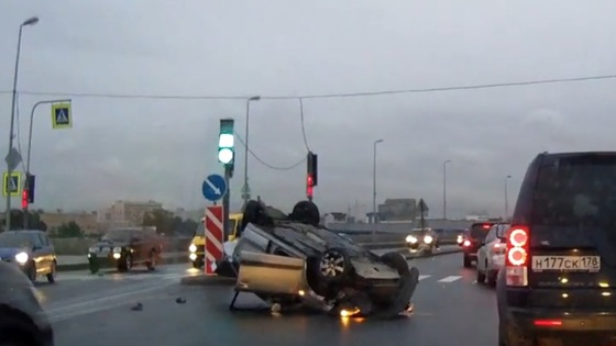 Регистратор запечатлел момент аварии с переворотом в Петербурге