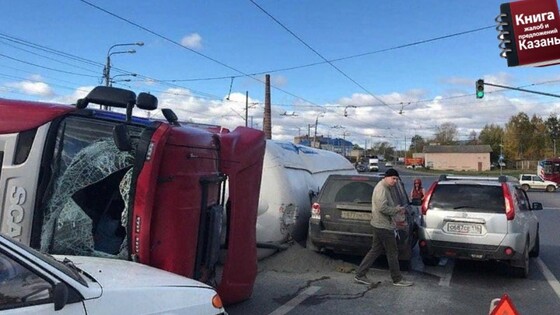 Перевернувшаяся автоцистерна с сухим цементом повредила пять легковых машин и на несколько часов заблокировала движение на перекрестке. Момент аварии попал в объектив камеры регистратора. ДТП произошло утром в четверг, 11 октября, когда водитель тяжелой машины на скорости вошел в поворот на Кировскую дамбу, но не смог удержать ее на колесах — цементовоз опрокинулся, а его содержимое высыпалось на асфальт. Кроме того, он задел пять легковушек, которые получили незначительные повреждения. Движение на дороге фактически было заблокировано, поскольку автоцистерну подняли и увезли только спустя 10 часов с момента аварии.