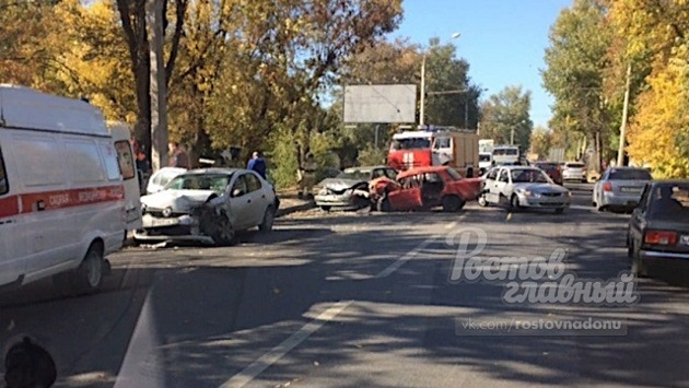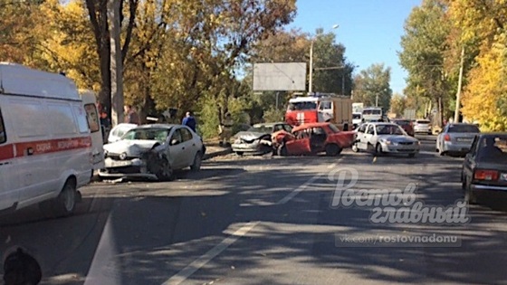 Сегодня, 12 октября, около 11:30 на улице Таганрогской в Ростове-на-Дону произошло столкновение сразу трех автомобилей - Renault Logan, ВАЗ-2101 и ВАЗ-2114. Об этом сообщает издание Donnews. Из-за удара передняя часть ВАЗ-2101 фактически была сдавлена в «гармошку», повреждения получили и остальные транспортные средства.Очевидцы сообщают о пострадавших, частности, пожилого мужчину, который управлял ВАЗ-2101, фактически зажало в собственной машине. Кроме того, одна из пострадавших женщин была госпитализирована. Сейчас из-за аварии на улице Таганрогской собралась большая пробка, в обе стороны.