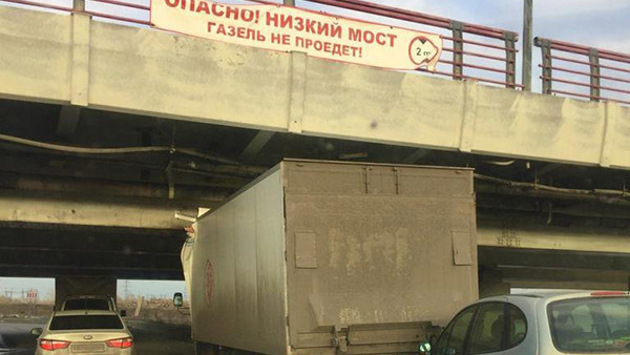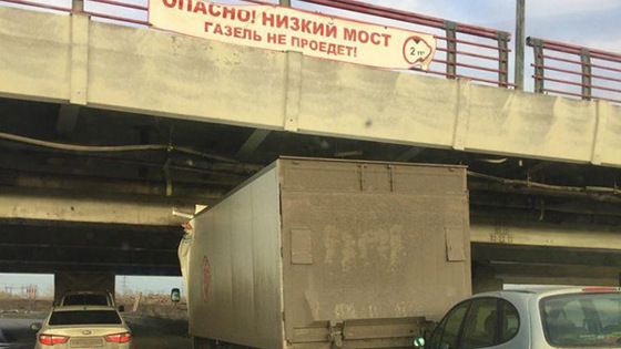 На мосту долгое время висел большой плакат «Опасно! Низкий мост! Газель не проедет!», но «Газели» снова и снова пытаются прорваться вперед и застревают.