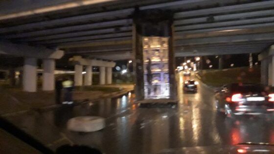 Вечером 26 октября самосвал, ехавший по Набережной улице в Калуге, зацепился кузовом за эстакаду, соединяющую улицу Гагарина с мостом через Оку. Фото Д.Колесова Судя по всему, в тот момент, когда грузовик проезжал под эстакадой на «гагаринской» развязке, произошло самопроизвольное срабатывание механизма подъема кузова. Самосвал ехал порожняком. По предварительным данным, люди не пострадали.