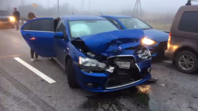 Сложные погодные условия, сложившиеся в Санкт-Петербурге утром 6 ноября, затруднили дорожное движение. Образовавшаяся на дороге корка льда спровоцировала столкновение сразу нескольких машин. Видео с места происшествия попало в распоряжение «360». На ролике видно, что в аварии пострадало не менее пяти автомобилей. Одна из машин от сильного удара перевернулась набок. Водители и пассажиры в ДТП не пострадали. Подробностей произошедшего пока нет.