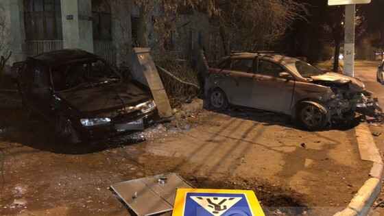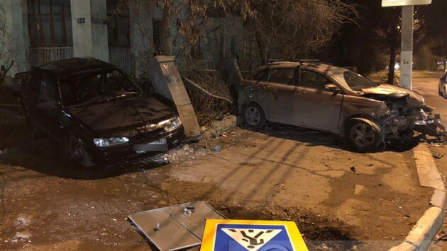 В Твери две легковушки снесли дорожный знак и выломали бетонный забор