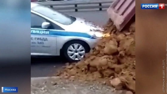 В Москве водитель КамАЗа засыпал автомобиль ГИБДД песком