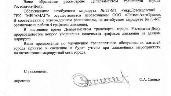 Ростовчане в соцсетях просят обратить внимание на автобусный маршрут № 73, на котором 1,5 месяц назад работало 10 машин, а сейчас только 4. Кроме этого, по информации горожан водители этого маршрута прекращают работу уже в 19.00, при том, что по расписанию должны ходить до 21.30. Это почти единственный маршрут, который связывает "Левенцовку" и проспект Коммунистический. В ноябре 2018 года департамент транспорта сообщил о проработке вопроса об увеличении графиков автобусного маршрута № 73, однако на деле на сегодняшний день чиновники ничего не предприняли, а может и вовсе забыли.