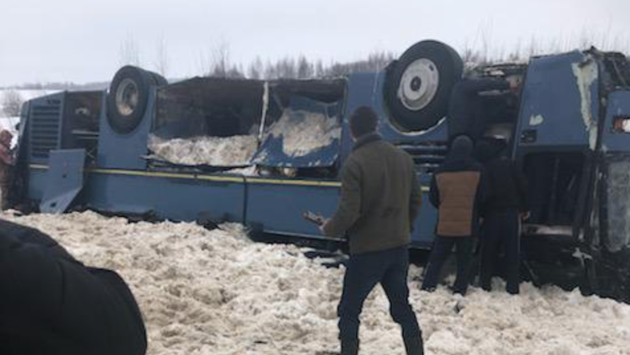 В нем находились 48 пассажиров, в том числе 33 ребенка. В пресс-службе МЧС заявили, что подготовлены два вертолета для возможной эвакуации детей. На месте работают бригады скорой, спасатели и полиция. Из автобуса извлекли 21 человека. Внутри заблокированы еще 6 человек.