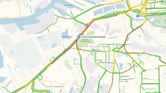 В Калининграде на ул. Суворова образовался двухкилометровый затор из-за аварии на перекрёстке с Транспортной. Об этом сообщает сервис "Яндекс.Карты". Пробка растянулась от заправки "Сургутнефтегаз" до поворота на Транспортную. Скорость движения на этом участке не превышает 7 км/ч. Затор также образовался на Камской и Киевской.