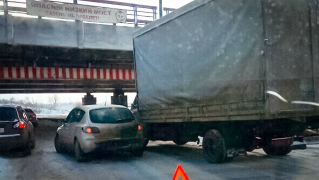 Последний случай произошел совсем недавно, в конце января. Тогда водитель не заметил знак, указывающий на то, что высота конструкции не превышает 2,1 метра, а на нижней балке моста – красно-белую разметку.