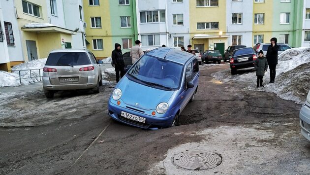 Легковой автомобиль застрял передним колесом в неожиданно образовавшимся провале. Как сообщили в социальных сетях очевидцы происшествия, яма образовалась в 3 Г микрорайоне Балакова Саратовской области, на территории домов так называемых обманутых дольщиков. По мнению пользователей, дефект в асфальте внутри вора возник из-за несоблюдения технологии укладки дорожного покрытия: буквально перед Новым годом во время сдачи долгостроя дорожники заливали бетон при отрицательных температурах. «Это еще только начало, так как основная часть дороги ещё не растаяла от льда», — предупреждает местных жителей автор поста. Фото: соцсети