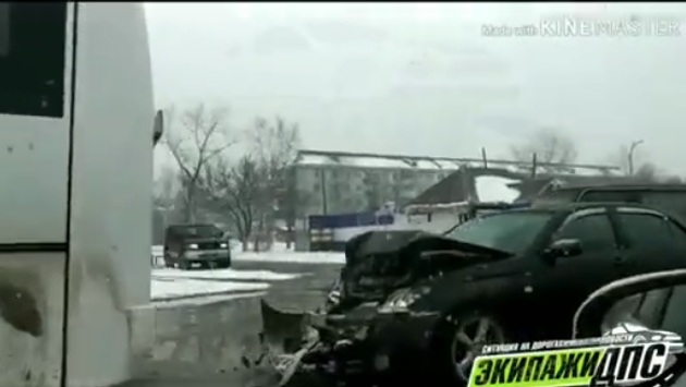 Иномарке разворотило «морду» после столкновением с автобусом в Приморье