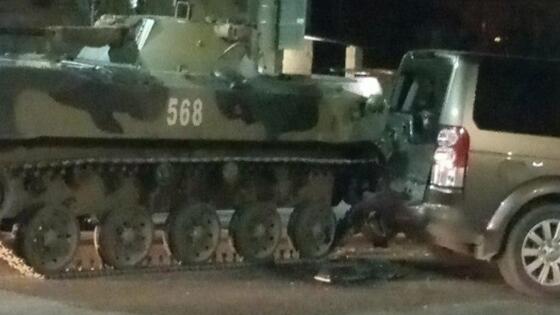 По словам очевидцев, ДТП произошло минувшим вечером на улице Гагарина. В местном управлении Министерства внутренних дел изданию подтвердили факт столкновения внедорожника с военной техникой, однако не на улице Гагарина, а на Октябрьской.