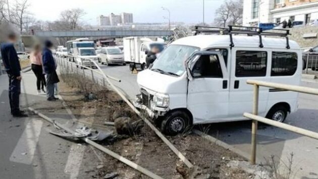 Во Владивостоке микроавтобус после столкновения с грузовиком «вылетел» на тротуар