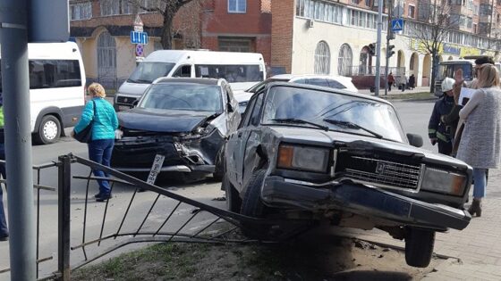 Перекресток улиц Суворова и Плеханова днем 11 апреля не поделили иномарка и ВАЗ 2107. Фото группы "Калуга за рулем" "ВКонтакте После столкновения отечественную легковушку отбросило на тротуар. Но до него Lada не долетела, зависнув на леерных ограждениях над газоном. Пока о пострадавших в этой аварии ничего не сообщается.