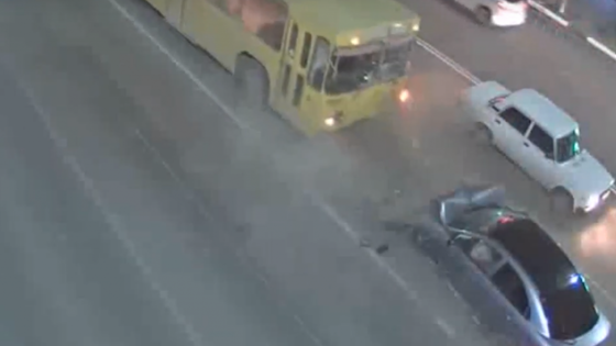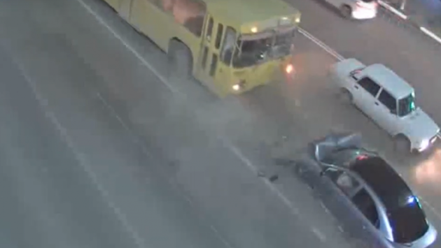 На записи видно, что иномарка едет на большой скорости по встречной полосе, а затем врезается в троллейбус, который от удара отъехал на несколько метров назад. Никто из участников аварии серьёзно не пострадал.