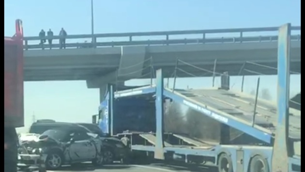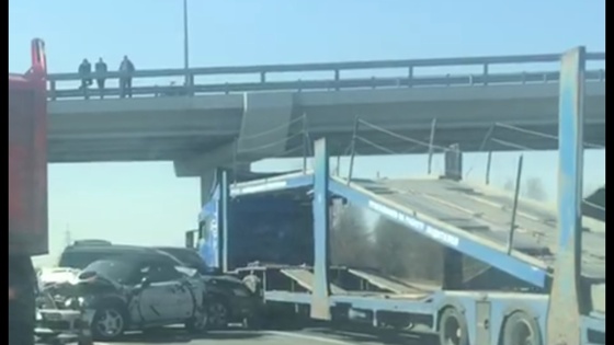 На КАДе произошла серьёзная авария с участием автовоза и иномарками