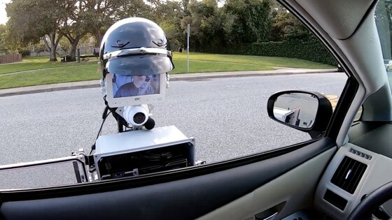 Как известно, в США при остановке автомобиля патрульным экипажем водителю запрещено покидать автомобиль, как это обычно происходит у нас. Американцы обязаны сидеть смирно и держать руки на руле, пока офицер не подойдёт к двери, в противном случае копы могут истолковать это как угрозу и даже применить табельное оружие. Чтобы снизить риск развития подобных конфликтных ситуаций, инженер из научно-исследовательского института SRI International смастерил робота для проверки документов, чтобы полицейским не нужно было даже выходить из патрульного автомобиля. Робот способен даже распечатать квитанцию для оплаты штрафа и отдать её водителю! Устройство прикрепляется к левому борту полицейского автомобиля на телескопической штанге и после остановки выдвигается на уровень окна водителя. При этом робот заодно подкладывает под колесо планку с шипами - на всякий случай. Для общения с водителем предусмотрен экран и камера, а также сканер для документов и принтер.