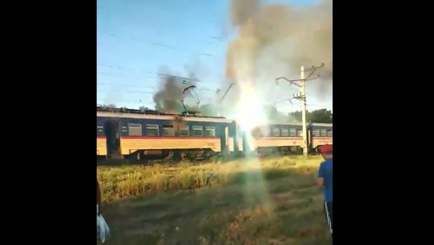 Ранним утром в субботу, 22 июня, неподалеку от станции "169-й километр" в окрестностях города Днепр на Украине вспыхнул пассажирский электропоезд. Инцидент попал в объектив камеры мобильного телефона очевидца. По предварительной информации, причиной инцидента стало замыкание в проводке. Пассажиры успели своевременно покинуть состав, в результате инцидента никто не пострадал. В настоящее время движение поездов восстановлено.