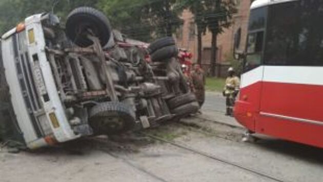 Трамвай уложил на бок автовышку на улице Петухова в Новосибирске
