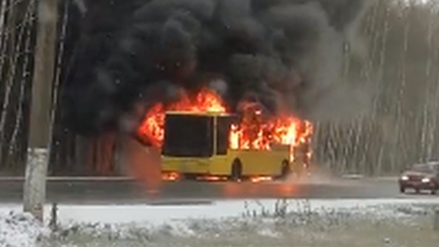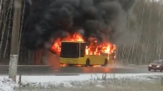 На кадрах видно, что стоящий на обочине автобус объят пламенем.