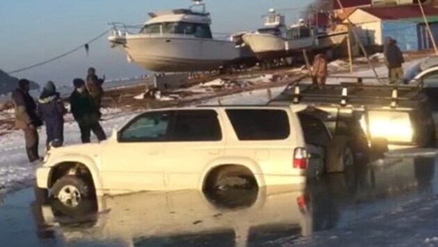 Помимо этого, рыбаки не придумали ничего лучше, как поставить транспорт рядом друг с другом. В результате лёд не выдержал такой нагрузки.