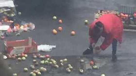 Авария случилась при разгрузке товара в 9 часов утра 17 января. Несколько ящиков с яблоками, мандаринами и апельсинами оказались на земле. На помощь водителю пришли продавцы. Все фрукты были собраны и перенесены в магазин.