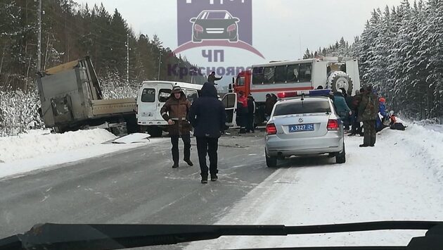 КРАСНОЯРСК, 17 января. /ТАСС/. Шесть человек пострадали в ДТП в Богучанском районе Красноярского края, где столкнулись два грузовых автомобиля и "Газель". Об этом ТАСС сообщили в Единой дежурно-диспетчерской службе района. "На 8-м километре автодороги Богучаны - Пинчуги столкнулись вахтовый грузовик "Камаз", еще один грузовой автомобиль и "Газель". Пострадали шесть человек", - сообщил собеседник агентства. По данным регионального Минздрава, в районную больницу доставлено шесть человек, из них 4 госпитализированы, один от госпитализации отказался, одного осматривают. Двое из госпитализированных находятся в тяжелом состоянии. По данным регионального главка МВД, грузовой автомобиль Freightliner допустил столкновение с микроавтобусом "Газель", ехавшем впереди, потом грузовик выехал на встречную полосу и столкнулся с "Камазом". В ДТП пострадали водитель и пять пассажиров микроавтобуса. По данным ЕДДС района, микроавтобус не являлся рейсовым общественным транспортом. По данным регионального главка МЧС, на месте ДТП работают 22 человека и 9 единиц техники.