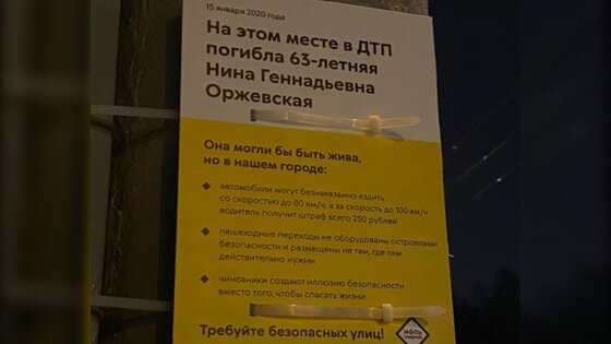 У светофорного столба на проспекте Ленина появилась памятная табличка погибшему пешеходу. Желто-белая доска расположена у завода им. Фрунзе. На ней сообщается, что 15 января 2020 года на этом месте была сбита 63-летняя Нина Оржевская. Она могла бы быть жива, но в нашем городе автомобили могут безнаказанно ездить со скоростью до 80 км/ч, а пешеходные переходы не оборудованы островками безопасности, — написано на табличке. На табличке значится, что она принадлежит к программе «Ноль смертей», которая входит в ряд городских проектов Ильи Варламова и Максима Каца. От сотрудников программы корреспондент ИА «В городе N» узнал, что подобная табличка в Нижнем Новгороде единственная и такие знаки размещены в нескольких городах России. Они обращают внимание на людей, погибших в ДТП. В России к десяткам тысяч жертв ДТП относятся как к неизбежной проблеме. СМИ часто обвиняют в ДТП самих жертв, и мало кто задумывается, как предотвратить эти смерти. Табличка же поясняет, какие меры нужно было предпринять, чтобы избежать этой трагедии, — написал собеседник агентства. Напомним, что 15 января на этом месте насмерть сбили пешехода.