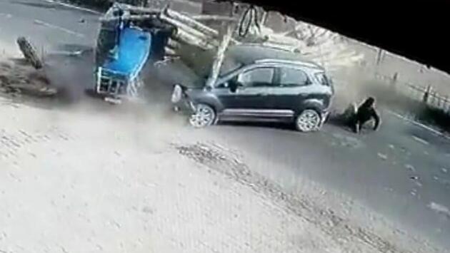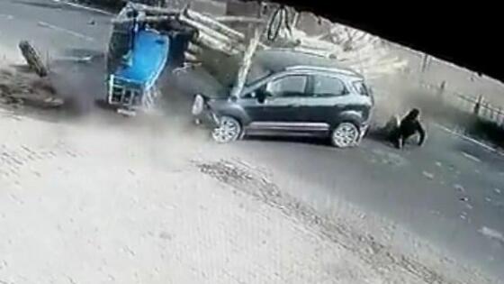 Камера наружного наблюдения, установленная на автодороге в городе Джагадхари (округ Ямунанагар, штат Харьяна, Индия) 15 февраля зафиксировала аварию, произошедшую по вине тракториста. Молодой человек, управлявший трактором, не справился с управлением и разнёс заграждение. Сельхозтехника выехала на встречную полосу и столкнулась с внедорожником. Трактористу повезло и он перед тем, как брёвна смяли кабину, успел покинуть транспортное средство, чудом не угодив под колёса легковушки. В результате ДТП, Санджай Гупта, владелец внедорожника получил лёгкую травму. Виновник аварии не пострадал.
