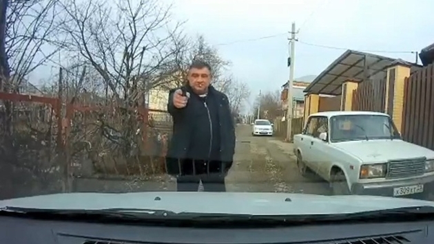 В городе Армавире Краснодарского края в дачном кооперативе угрожал водителю зажигалкой, похожей на пистолет. Видео с регистратора выложил в сеть пострадавший водитель. Мужчина на своем автомобиле ехал по одной из улиц в районе Каспаровских дач. В этот момент навстречу ему вышел пьяный местный житель и направил на него пистолет. Как выяснилось позже это была зажигалка, выполненная в форме пистолета. Однако пьяного мужчину все равно задержала полиция за хулиганство. По словам местных жителей мужчина работает водителем автобуса и часто пьет. Инцидент произошел 21 февраля.