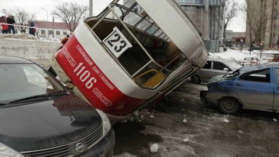 В Самаре произошло нетипичное ДТП. Трамвай сошел с рельсов и завалился набок, на припаркованные рядом автомобили. Машины расплющило под трамваем. К счастью при этой аварии никто не погиб и не пострадал. Нанесен урон только пяти автомобилям, на которые упал трамвай, следующий по маршруту № 23. Как выяснилось позже незадолго до ДТП в вагоне произошла техническая поломка и началось задымление. Машинист высадила всех пассажиров и вышла сама на улицу. После чего вагон самостоятельно поехал вперед и на первом же повороте сошел с рельсов и вылетел на парковку.