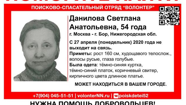 Женщина пропала 27 апреля. 54-летняя Светлана Анатольевна Данилова разыскивается в Нижегородской области. Об этом сообщает поисково-спасательный отряд «Волонтер-НН». Женщина пропала по дороге из Москвы в Бор 27 апреля. Она уже почти неделю не выходит на связь. Водителей, которые 28 апреля проезжали по трассе Р-159 по направлению от Неклюдово в сторону Нижнего Новгорода просят сохранить и по возможности предоставить записи с видеорегистраторов. Пропавшая худощавого телосложения, с русыми волосами и голубыми глазами. Была одета в темно-синюю куртку и платок, коричневый свитер. Информацию о пропавшей можно сообщить по телефону 291−51−51 либо по каналу связи 102. Ранее сообщалось, что пропавший в Нижнем Новгороде Сергей Толстяков найден погибшим.