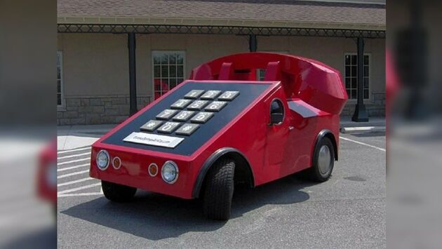 The Phone Car действительно внешне является практически точной копией телефонного аппарата. Идея необычного транспортного средства появилась у энтузиаста Говарда Дэвиса. Натолкнул на нее рядовой офисный кнопочный телефон. И вот в 1983 году Дэвис совместно с механиком из Бостона Дэйвом Хантрессом представили миру The Phone Car. Работа над машиной заняла примерно полтора года. За основу был взят Volkswagen Beetle 1975 года, купленный Дэвисом всего за 125 долларов. Техническую часть не меняли, но вот алюминиевый кузов в виде телефона автомобиль получил новый. В роли лобового стекла выступает затонированная черная панель с нанесенными на нее изображениями символических клавиш. Понятно, что при этом немного затруднен обзор для водителя и пассажиров. Вполне естественно, что сигналом клаксона служит звонок. Кстати, и номерной знак автомобиль имеет соответствующий - PHONE. Машина имеет право передвигаться по дорогам и часто является участником многочисленных шоу. Кроме того, ее берут в аренду на праздники. Интересно, что за все время The Phone Car не был объектом внимания полиции. Единственная неприятность случилось с оригинальным автомобилем в 2011 году. В гараже крыша не справилась со снегом и повредила авто.