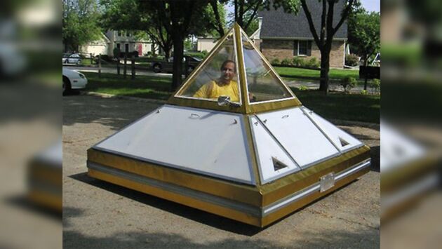 В Сети появилось видео, на котором демонстрируется, как по дорогам рассекает транспортное средство в форме пирамиды. Данное авто передвигается за счёт энергии солнца. Пирамиду на колесах запечатлели в американском штате Иллинойс. Данное транспортное средство удивило пользователей Сети и местных жителей своим внешним видом, а также размерами. Автором данного проекта стал Грег Занис, являющийся эмигрантом из Греции. Изобретатель уже давно утверждал, что вокруг людей находится огромное количество природной энергии, которую попросту не используют. Вместо этого обычные автомобили загрязняют атмосферу выхлопными газами. Грег уже успел запатентовать автомобиль-пирамиду. Авто рассчитано на одного водителя. Необычное транспортное средство функционирует благодаря солнечным батареям. Если такую систему в дальнейшем усовершенствовать, авто сможет ускоряться до 300 миль/час. По словам Грега Заниса, его машина является полностью безопасной, экологичной, шустрой и лёгкой в управлении. По его словам даже неопытным водителям и девушкам будет под силу быстро освоить искусство вождения этим необычным аппаратом.