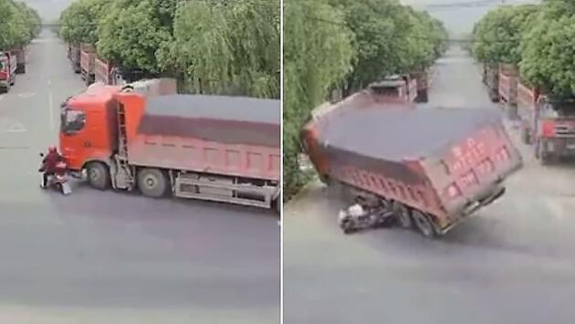 Драматичное происшествия, случившееся а конце мая по вине мотоциклиста, попало в объектив камеры наружного наблюдения, установленной на перекрёстке дорог в небольшом населённом пункте в Китае. Водитель грузовика, пытаясь уйти от столкновения с мотоциклистом, не справился с управлением и завалил большегруз на обочине дороги. Владельцу двухколёсного транспортного средства очень повезло и он отделался несколькими синяками, когда практически угодил под перевернувшийся многотонный прицеп.