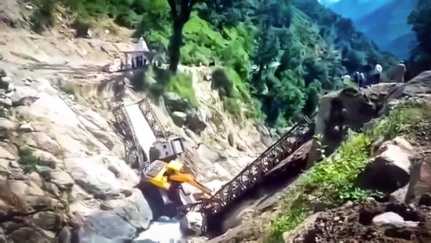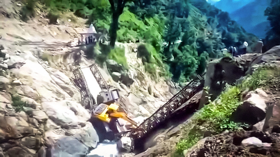 Конструкция моста, перекинутого через ущелье в 50 км от границы с Китаем, оказалась слишком слабой для тяжеловоза, груженного экскаватором.