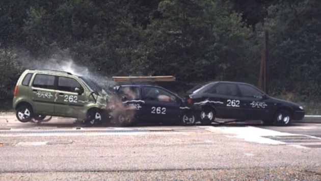 В Сети появилось видео демонстрации последствий ДТП с участием нескольких автомобилей. Эксперимент провела компания Dynamic Test Center, изучающая безопасность транспортных средств. В целях исследования на дороге припарковали две иномарки — Renault Twingo и Citroen Xsara. По задумке в Renault врезается на скорости 92,4 километра в час машина модели Opel Agila, на крыше которой дополнительно закрепили листы дерева в целях проверки того, насколько опасно столкновение с грузом на крыше. Удар Opel совершили со 100-процентны перекрытием. В этом авто также на место водителя посадили манекен и пристегнули. После ДТП его заблокировало, а подушка безопасности не сработала. При этом закрепленный на машине груз при столкновении полетел вперед со скоростью 90 километров в час и прошелся по обоим припаркованным автомобилям. У Renault, принявшего на себя основной удар, оказался деформирован салон, особенно сзади. Передняя и боковые подушки безопасности сработали. У Citroen также раскрылись обе фронтальные подушки. Читайте также: Россия провела эксперимент по применению «роя» истребителей