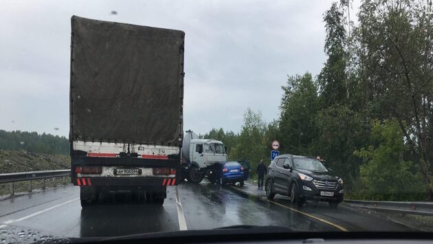 На ЕКАД возле Кольцово легковушка залетела под КамАЗ