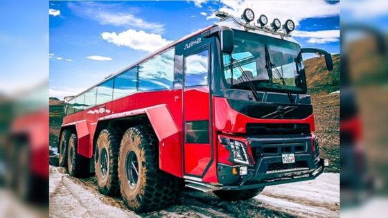 Этот уникальный внедорожный автобус по имени Sleipnir доставляет туристов на ледник Ланжекюлль, преодолевая 3-метровые трещины во льду. Sleipnir - самый огромный туристический автобус на планете. Его изготовление обошлось заказчику в 10 млн. исландских крон, или 35 млн. руб. Колеса у автобуса настолько велики, что используются 78-дюймовые шины, а диаметр самих колес доходит до двух метров. Передняя часть автобуса представляет собой часть кузова строительного грузовика Volvo FMX. Высота туристического автобуса - 5 метров, и весит он 20 тонн. Несмотря на высокую проходимость, у автобуса есть свой предел возможностей преодолевать суровый ландшафт исландских ледников. Однажды тот застрял в смеси снега и воды, глубиной два метра. Такая глубокая полынья образовалась из-за глобального потепления, когда в Исландии наступила среди зимы аномально теплая погода. Самый большой сюрприз туристов поджидает, когда те узнают, что между огромными колесами автобуса находится не менее громадная плита-гриль, на которой повара приготовят обед для всей тургруппы. И это впечатляет не менее, чем сам автобус.