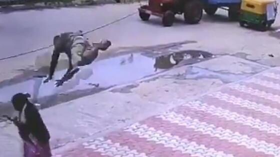 Пешеход, стоящий возле кабеля, неожиданно катапультировался и упал на женщину в Индии