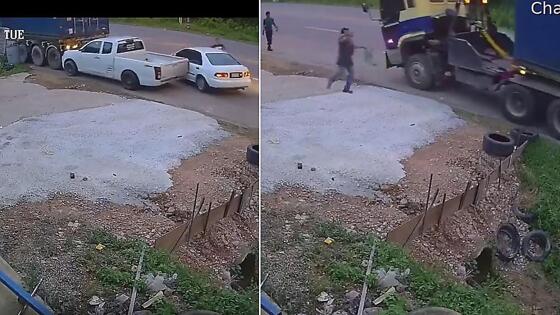 Странный инцидент, произошедший 25 августа на территории придорожного автосервиса, попал в объектив видеокамеры наружного наблюдения. Водитель длиннобазного транспортного средства, у которого для ремонта была опрокинута кабина, упустил фуру, которая съезжая задним ходом с уклона дороги, увлекла за собой двигавшийся во встречном направлении пикап. Один из участников дорожного движения, управляя легковушкой, на глазах у многочисленных очевидцев инцидента в самый последний момент успел отъехать в сторону. Автор видеоролика, размещённого на развлекательном канале в Yоutubе не уточнил никаких деталей странного происшествия.