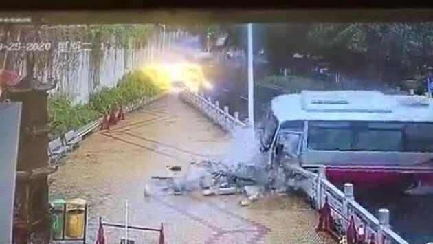Водитель вышедшего из-под контроля микроавтобуса «катапультировался» из кабины в Китае - видео