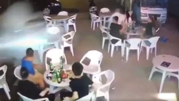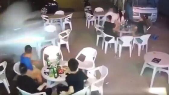 Момент появления легковушки, находящейся под управлением неадекватного водителя, сбившей нескольких человек, сидящих за столиком уличной закусочной в городе Ланфан (провинция Хэбэй, КНР), 28 августа запечатлела камера установленная в питейном заведении. По сообщениям местных СМИ, молодой человек, поссорившийся со своей девушкой, находящийся в состоянии опьянения и не имеющий водительского удостоверения, разогнал легковой автомобиль до скорости свыше ста километров в час, а затем въехал в придорожное кафе, в результате чего трём посетителям закусочной и виновнику происшествия потребовалась помощь медицинского персонала.