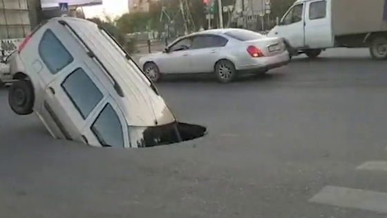 Очевидцы сняли на видео, как Lada попала передними колёсами в образовавшийся посреди проезжей части провал. Через несколько секунд яма стала огромной, и автомобиль почти наполовину ушёл под землю.