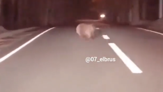 Выбежавший на трассу медведь испугал водителя в Кабардино – Балкарии Пользователи социальных сетей Кабардино – Балкарии обсуждают видеозапись, на которой запечатлено, как на ночной трассе медведь пробежал перед легковушкой Видно, как косолапый несется на большой скорости вдоль проезжей части, а затем резко перебегает на другую сторону. Как рассказал автор поста, опубликованного в инстаграм – группе «Подслушано Нальчик», запись была сделана на видеорегистратор автомобиля между населенными пунктами Тегенекли и Байдаево. «Немного было страшно, когда увидел медведя, но потом он сам испугался рева двигателя и фар»,- добавил автолюбитель.