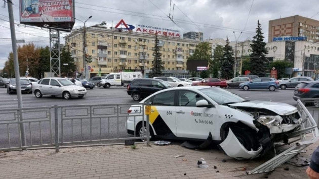 В центре Воронежа Яндекс.Такси протаранило ограждение и вылетело на тротуар