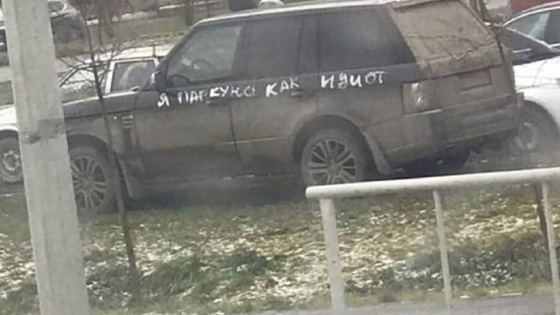В Тюмени водителю «Ленд Ровера» напомнили о запрете парковки на газонах. На внедорожнике оставили нелестную надпись: «Я паркуюсь как идиот».