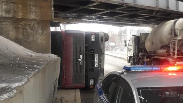 В Екатеринбурге под мостом перевернулся мусоровоз