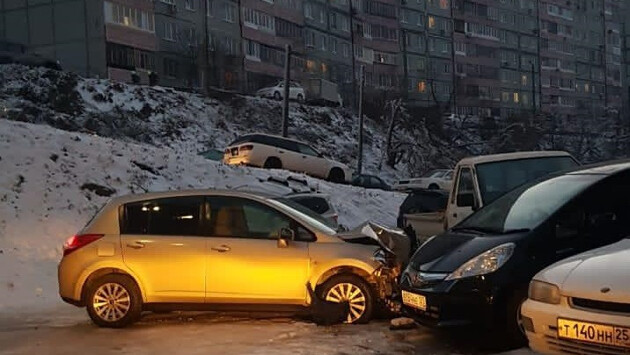 Автомобили, теряющие управление на покрытых гололедицей и снежным накатом сопках Владивостока и летящие вниз, неподвластные водителям, увы, не редкость. Один из таких инцидентов произошёл 25 ноября в 07:35, судя по дате на камере видеонаблюдения. В редакцию ИА DEITA.RU очевидцы прислали видеозапись аварии. Автомобиль пытался совершить подъём по ул. Черняховского, но машину развернуло, и она понеслась вниз. Девушка за рулём вышедшего из-под контроля автомобиля от испуга случайно нажала на педаль газа, усугубив ситуацию. В своём стремительном движении вниз легковушка задела автомобиль Toyota Harrier, а приземлившись под окна многоквартирного дома, помяла пикап, «Honda Fit» и старенький «Nissan Presea». По словам очевидца, у водительницы тяжёлая травма – перелом позвоночника. В очередной раз напоминаем приморцам, что текущая дорожная ситуация опасна и для водителей, и для пешеходов. По статистике, приведённой краевым правительством, только в период с 19 по 22 ноября только во Владивостоке и Артёме в травмпункты обратились 663 человека.